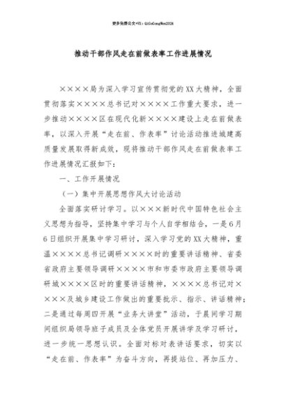 【七哥公文】2025年:【七哥公文】推动干部作风走在前做表率工作进展情况+更多免费公文+VX:QiGeGongWen2024+更多免费公文+VX:QiGeGongWen2024