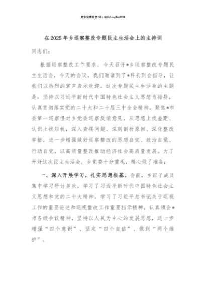 【七哥公文】2025年:【七哥公文】在2025年乡巡察整改专题民主生活会上的主持词+更多免费公文+VX:QiGeGongWen2024+更多免费公文+VX:QiGeGongWen2024