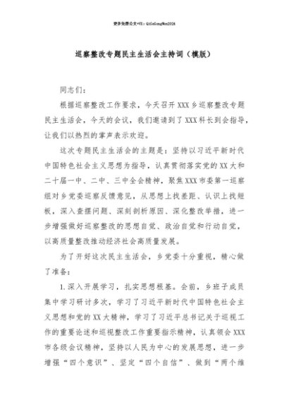 【七哥公文】2025年:【七哥公文】巡察整改专题民主生活会主持词(模版)+更多免费公文+VX:QiGeGongWen2024+更多免费公文+VX:QiGeGongWen2024