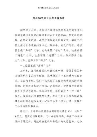 【七哥公文】2025年:【七哥公文】国企2025年上半年工作总结+更多免费公文+VX:QiGeGongWen2024+更多免费公文+VX:QiGeGongWen2024