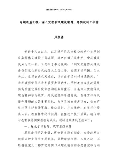 【七哥公文】2025年:【七哥公文】专题进展汇报:深入贯彻作风建设精神,夯实政研工作作风根基+更多免费公文+VX:QiGeGongWen2024+更多免费公文+VX:QiGeGongWen2024