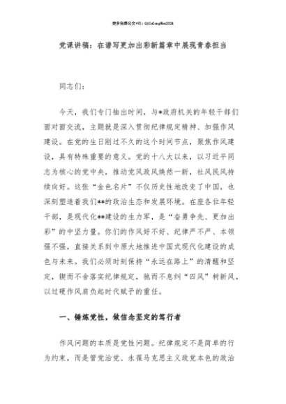 【七哥公文】2025年:【七哥公文】党课讲稿:在谱写更加出彩新篇章中展现青春担当+更多免费公文+VX:QiGeGongWen2024+更多免费公文+VX:QiGeGongWen2024