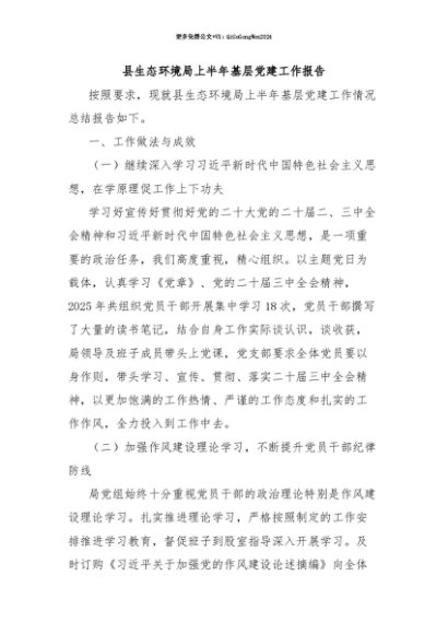 【七哥公文】2025年:【七哥公文】县生态环境局上半年基层党建工作报告+更多免费公文+VX:QiGeGongWen2024+更多免费公文+VX:QiGeGongWen2024