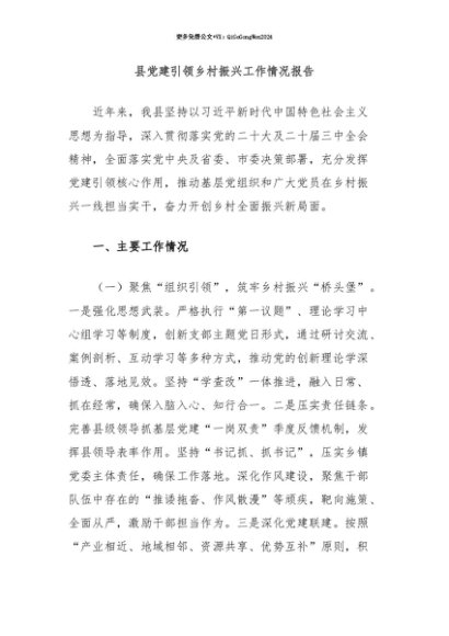 【七哥公文】2025年:【七哥公文】县党建引领乡村振兴工作情况报告+更多免费公文+VX:QiGeGongWen2024+更多免费公文+VX:QiGeGongWen2024