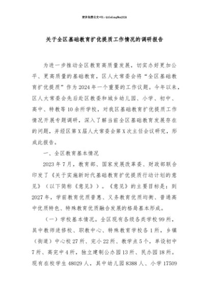 【七哥公文】2025年:【七哥公文】关于全区基础教育扩优提质工作情况的调研报告+更多免费公文+VX:QiGeGongWen2024+更多免费公文+VX:QiGeGongWen2024