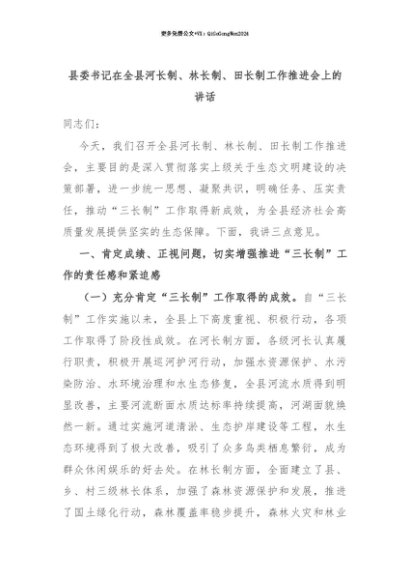 【七哥公文】2025年:【七哥公文】县委书记在全县河长制、林长制、田长制工作推进会上的讲话+更多免费公文+VX:QiGeGongWen2024+更多免费公文+VX:QiGeGongWen2024