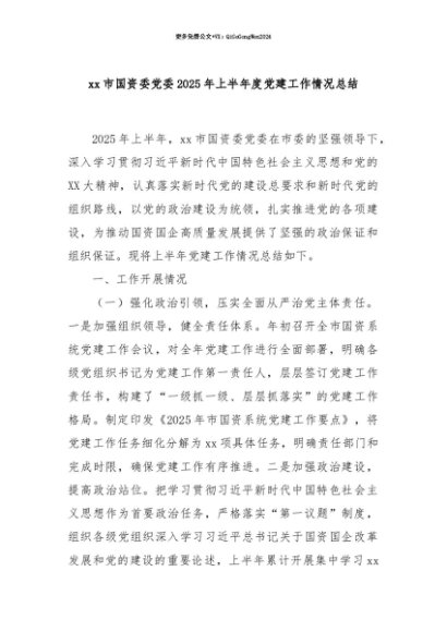 【七哥公文】2025年:【七哥公文】xx市国资委党委2025年上半年度党建工作情况总结+更多免费公文+VX:QiGeGongWen2024+更多免费公文+VX:QiGeGongWen2024