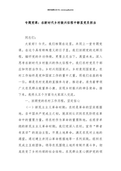 【七哥公文】2025年:【七哥公文】专题党课:在新时代乡村振兴征程中彰显党员担当+更多免费公文+VX:QiGeGongWen2024+更多免费公文+VX:QiGeGongWen2024