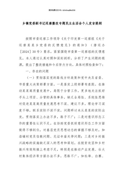【七哥公文】2025年:【七哥公文】乡镇党委副书记巡察整改专题民主生活会个人发言提纲+更多免费公文+VX:QiGeGongWen2024+更多免费公文+VX:QiGeGongWen2024
