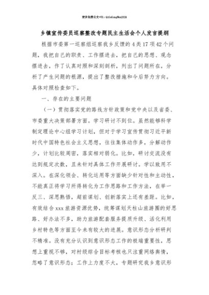 【七哥公文】2025年:【七哥公文】乡镇宣传委员巡察整改专题民主生活会个人发言提纲+更多免费公文+VX:QiGeGongWen2024+更多免费公文+VX:QiGeGongWen2024