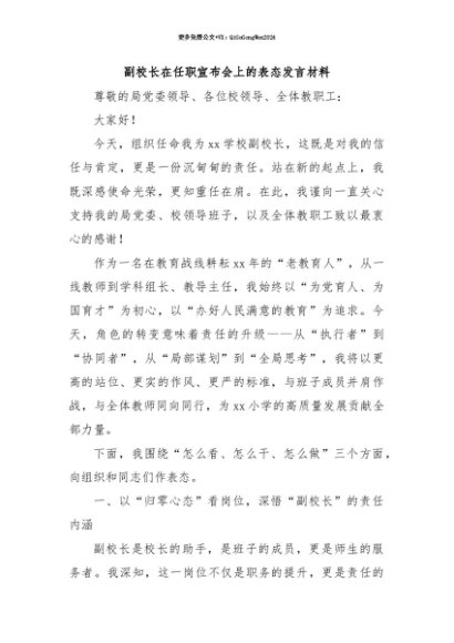 【七哥公文】2025年:【七哥公文】副校长在任职宣布会上的表态发言材料+更多免费公文+VX:QiGeGongWen2024+更多免费公文+VX:QiGeGongWen2024