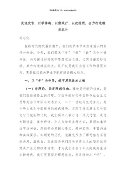 【七哥公文】2025年:【七哥公文】交流发言:以学铸魂、以做践行、以改提质,全力打造模范机关+更多免费公文+VX:QiGeGongWen2024+更多免费公文+VX:QiGeGongWen2024