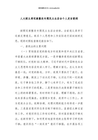 【七哥公文】2025年:【七哥公文】人大副主席巡察整改专题民主生活会个人发言提纲+更多免费公文+VX:QiGeGongWen2024+更多免费公文+VX:QiGeGongWen2024