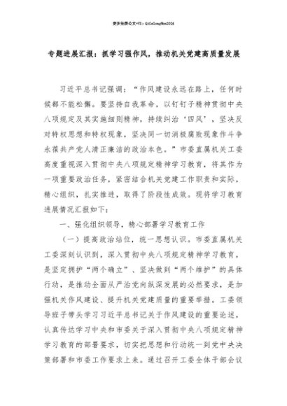 【七哥公文】2025年:【七哥公文】专题进展汇报:抓学习强作风,推动机关党建高质量发展+更多免费公文+VX:QiGeGongWen2024+更多免费公文+VX:QiGeGongWen2024