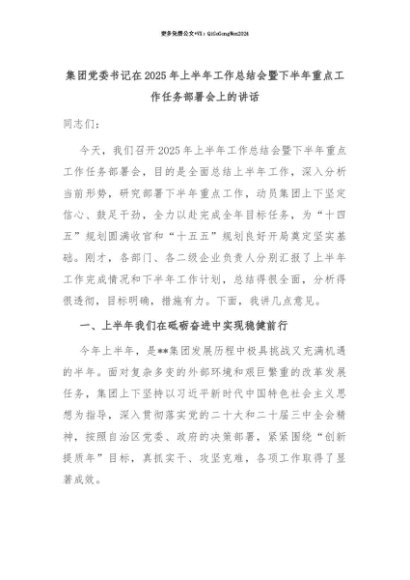 【七哥公文】2025年:【七哥公文】集团党委书记在2025年上半年工作总结会暨下半年重点工作任务部署会上的讲话+更多免费公文+VX:QiGeGongWen2024+更多免费公文+VX:QiGeGongWen2024