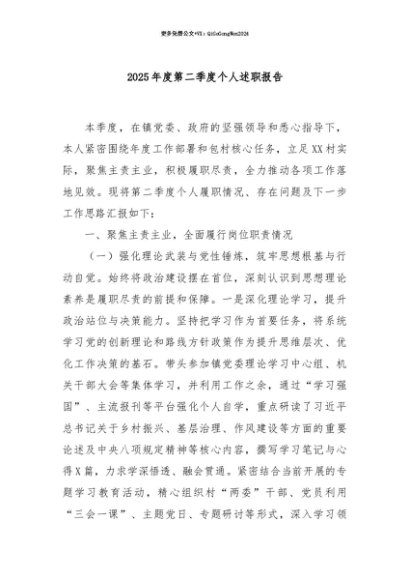 【七哥公文】2025年:【七哥公文】2025年度第二季度个人述职报告+更多免费公文+VX:QiGeGongWen2024+更多免费公文+VX:QiGeGongWen2024