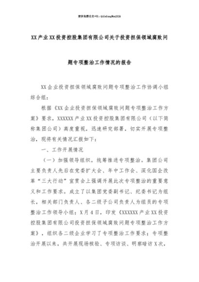 【七哥公文】2025年:【七哥公文】XX产业XX投资控股集团有限公司关于投资担保领域腐败问题专项整治工作情况的报告+更多免费公文+VX:QiGeGongWen2024+更多免费公文+VX:QiGeGongWen2024