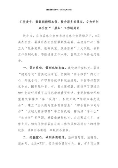 【七哥公文】2025年:【七哥公文】汇报发言:聚焦职能强本领,提升服务抓落实,奋力开创办公室“三服务”工作新局面+更多免费公文+VX:QiGeGongWen2024+更多免费公文+VX:QiGeGongWen2024