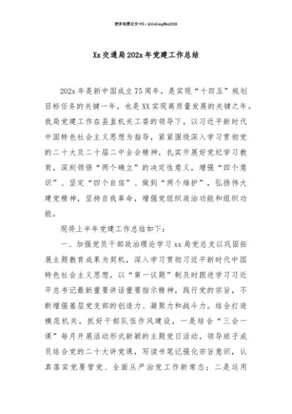 【七哥公文】2025年:【七哥公文】Xx交通局202x年党建工作总结+更多免费公文+VX:QiGeGongWen2024+更多免费公文+VX:QiGeGongWen2024