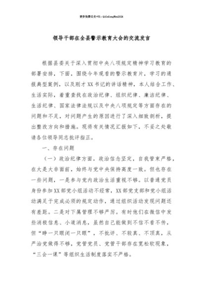 【七哥公文】2025年:【七哥公文】领导干部在全县警示教育大会的交流发言+更多免费公文+VX:QiGeGongWen2024+更多免费公文+VX:QiGeGongWen2024