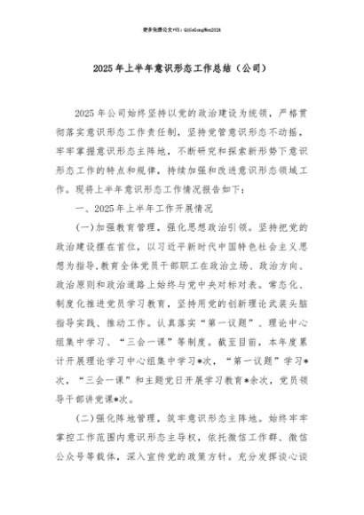 【七哥公文】2025年:【七哥公文】2025年上半年意识形态工作总结(公司)+更多免费公文+VX:QiGeGongWen2024+更多免费公文+VX:QiGeGongWen2024