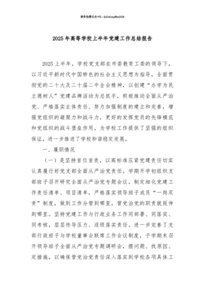 【七哥公文】2025年:【七哥公文】2025 年高等学校上半年党建工作总结报告+更多免费公文+VX:QiGeGongWen2024+更多免费公文+VX:QiGeGongWen2024