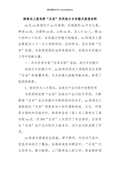 【七哥公文】2025年:【七哥公文】街道关工委发挥“五老”作用助力乡村振兴典型材料+更多免费公文+VX:QiGeGongWen2024+更多免费公文+VX:QiGeGongWen2024