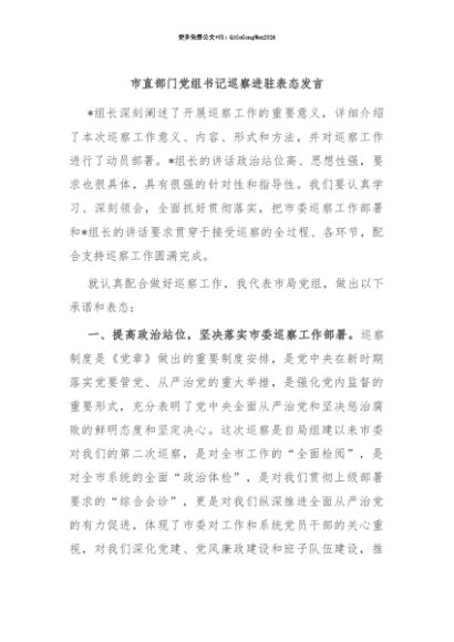 【七哥公文】2025年:【七哥公文】市直部门党组书记巡察进驻表态发言+更多免费公文+VX:QiGeGongWen2024+更多免费公文+VX:QiGeGongWen2024