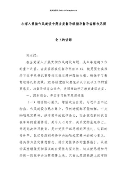 【七哥公文】2025年:【七哥公文】在深入贯彻作风建设专题省委督导组指导督导省辖市见面会上的讲话+更多免费公文+VX:QiGeGongWen2024+更多免费公文+VX:QiGeGongWen2024