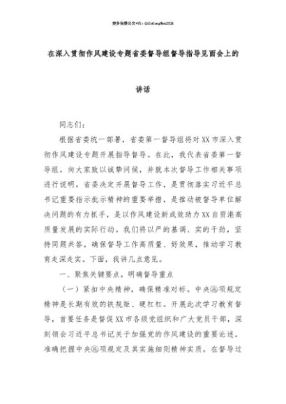 【七哥公文】2025年:【七哥公文】在深入贯彻作风建设专题省委督导组督导指导见面会上的讲话+更多免费公文+VX:QiGeGongWen2024+更多免费公文+VX:QiGeGongWen2024
