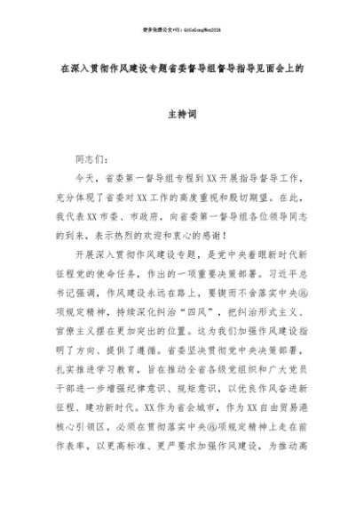 【七哥公文】2025年:【七哥公文】在深入贯彻作风建设专题省委督导组督导指导见面会上的主持词+更多免费公文+VX:QiGeGongWen2024+更多免费公文+VX:QiGeGongWen2024