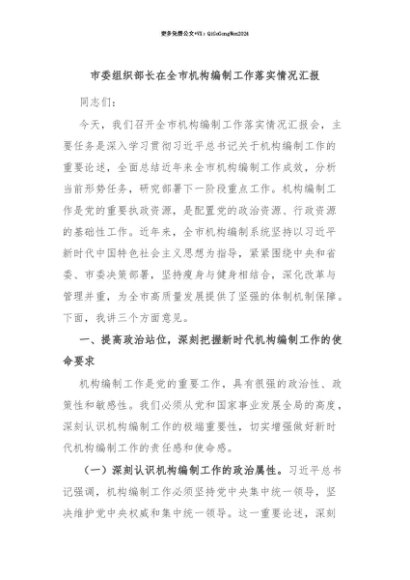 【七哥公文】2025年:【七哥公文】市委组织部长在全市机构编制工作落实情况汇报+更多免费公文+VX:QiGeGongWen2024+更多免费公文+VX:QiGeGongWen2024