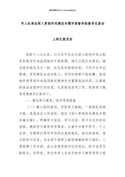 【七哥公文】2025年:【七哥公文】市人社局在深入贯彻作风建设专题市委督导组督导见面会上的汇报发言+更多免费公文+VX:QiGeGongWen2024+更多免费公文+VX:QiGeGongWen2024