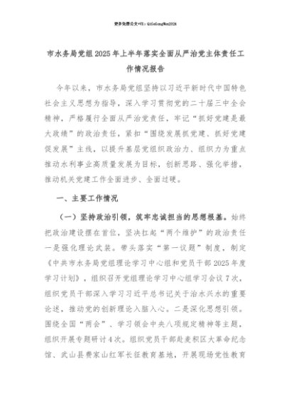 【七哥公文】2025年:【七哥公文】市水务局党组2025年上半年落实全面从严治党主体责任工作情况报告+更多免费公文+VX:QiGeGongWen2024+更多免费公文+VX:QiGeGongWen2024