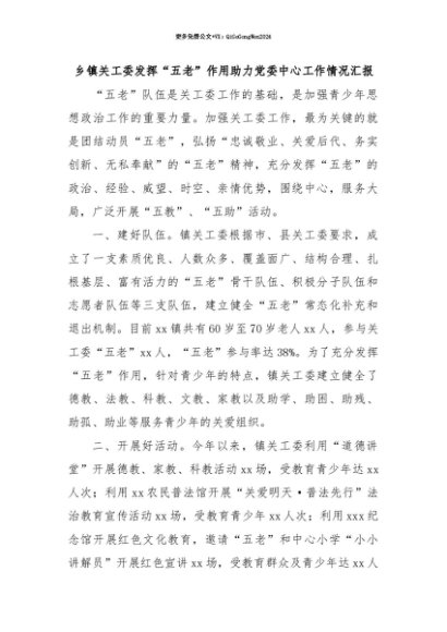 【七哥公文】2025年:【七哥公文】乡镇关工委发挥“五老”作用助力党委中心工作情况汇报+更多免费公文+VX:QiGeGongWen2024+更多免费公文+VX:QiGeGongWen2024