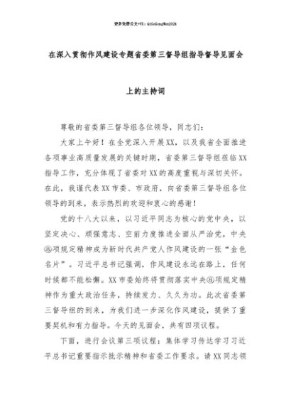 【七哥公文】2025年:【七哥公文】在深入贯彻作风建设专题省委第三督导组指导督导见面会上的主持词+更多免费公文+VX:QiGeGongWen2024+更多免费公文+VX:QiGeGongWen2024