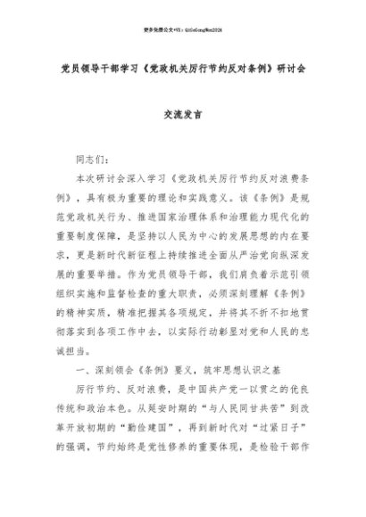 【七哥公文】2025年:【七哥公文】党员领导干部学习《党政机关厉行节约反对条例》研讨会交流发言+更多免费公文+VX:QiGeGongWen2024+更多免费公文+VX:QiGeGongWen2024