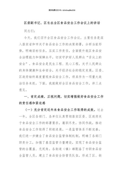 【七哥公文】2025年:【七哥公文】区委副书记、区长在全区食品安全工作会议上的讲话+更多免费公文+VX:QiGeGongWen2024+更多免费公文+VX:QiGeGongWen2024