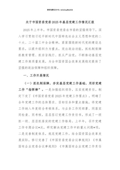 【七哥公文】2025年:【七哥公文】关于市国资委党委2025年基层党建工作情况汇报+更多免费公文+VX:QiGeGongWen2024+更多免费公文+VX:QiGeGongWen2024