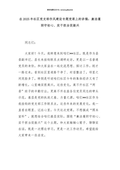 【七哥公文】2025年:【七哥公文】在2025年社区党支部作风建设专题党课上的讲稿:廉洁履职守初心、实干担当促振兴+更多免费公文+VX:QiGeGongWen2024+更多免费公文+VX:QiGeGongWen2024