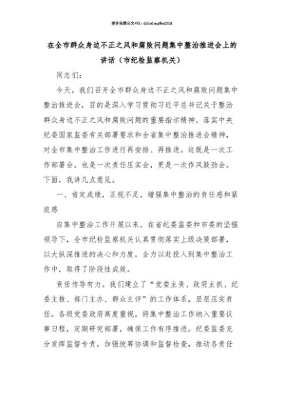 【七哥公文】2025年:【七哥公文】在全市群众身边不正之风和腐败问题集中整治推进会上的讲话(市纪检监察机关)+更多免费公文+VX:QiGeGongWen2024+更多免费公文+VX:QiGeGongWen2024