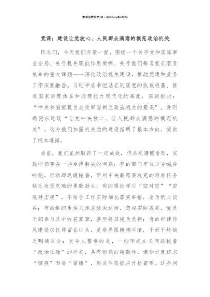 【七哥公文】2025年:【七哥公文】党课:建设让党放心、人民群众满意的模范政治机关+更多免费公文+VX:QiGeGongWen2024+更多免费公文+VX:QiGeGongWen2024