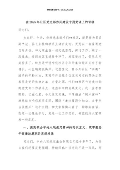 【七哥公文】2025年:【七哥公文】在2025年社区党支部作风建设专题党课上的讲稿+更多免费公文+VX:QiGeGongWen2024+更多免费公文+VX:QiGeGongWen2024
