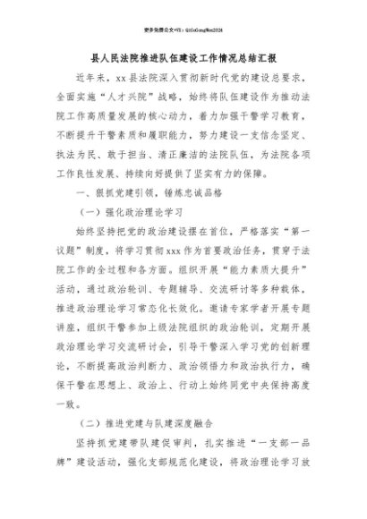【七哥公文】2025年:【七哥公文】县人民法院推进队伍建设工作情况总结汇报+更多免费公文+VX:QiGeGongWen2024+更多免费公文+VX:QiGeGongWen2024