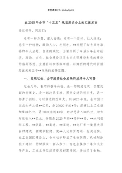 【七哥公文】2025年:【七哥公文】在2025年全市“十五五”规划座谈会上的汇报发言+更多免费公文+VX:QiGeGongWen2024+更多免费公文+VX:QiGeGongWen2024