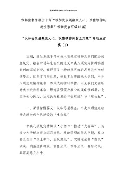 【七哥公文】2025年:【七哥公文】(3篇)市场监督管理所干部“以加快发展凝聚人心、以整顿作风树立形象”活动发言汇编+更多免费公文+VX:QiGeGongWen2024+更多免费公文+VX:QiGeGongWen2024