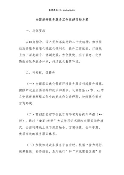 【七哥公文】2025年:【七哥公文】全面提升政务服务工作效能行动方案+更多免费公文+VX:QiGeGongWen2024+更多免费公文+VX:QiGeGongWen2024