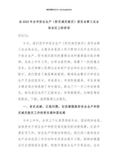 【七哥公文】2025年:【七哥公文】在2025年全市安全生产(防灾减灾救灾)委员会第三次全体会议上的讲话+更多免费公文+VX:QiGeGongWen2024+更多免费公文+VX:QiGeGongWen2024