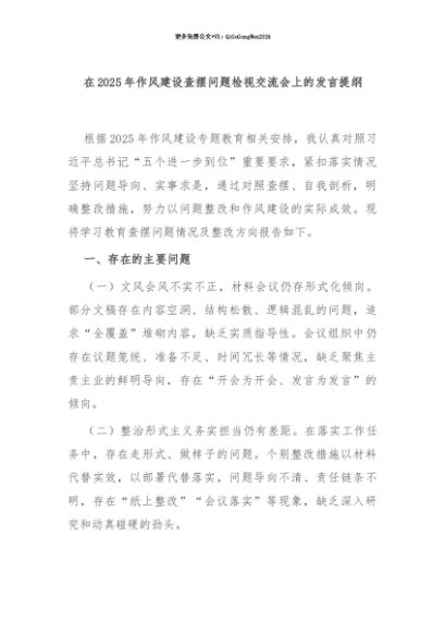 【七哥公文】2025年:【七哥公文】在2025年作风建设查摆问题检视交流会上的发言提纲+更多免费公文+VX:QiGeGongWen2024+更多免费公文+VX:QiGeGongWen2024