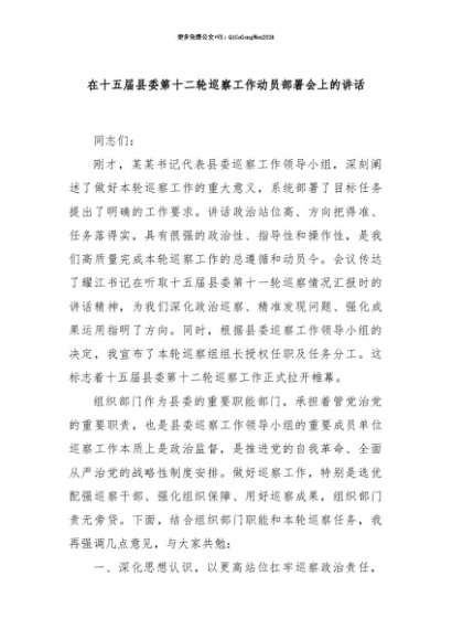 【七哥公文】2025年:【七哥公文】在十五届县委第十二轮巡察工作动员部署会上的讲话+更多免费公文+VX:QiGeGongWen2024+更多免费公文+VX:QiGeGongWen2024